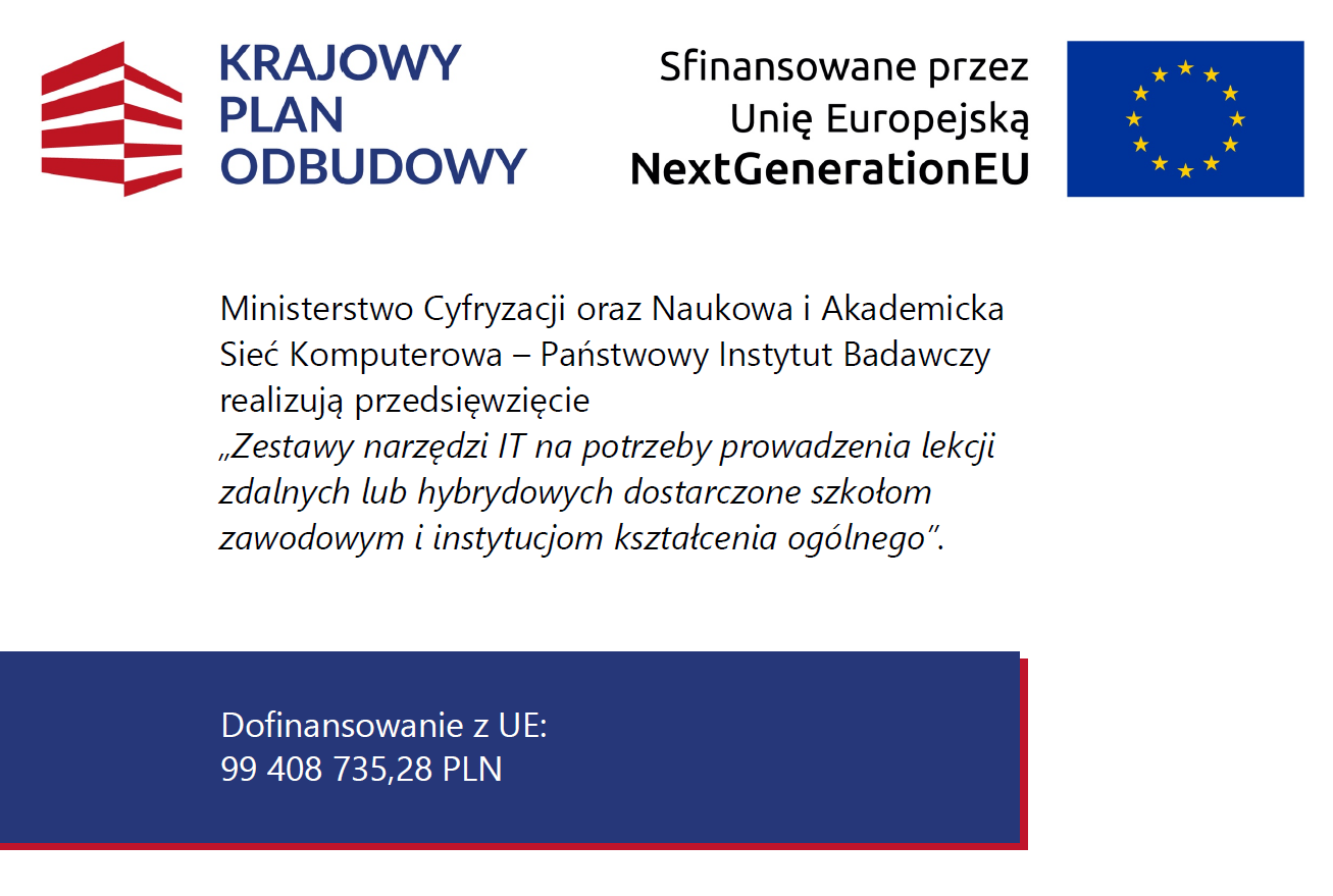 „Wdrażanie inwestycji C2.1.2 – Wyrównanie poziomu wyposażenia szkół w przenośne urządzenia multimedialne – inwestycje związane ze spełnieniem minimalnych standardów sprzętowych, wskaźnik C15G Nowe komputery przenośne (laptopy, laptopy przeglądarkowe i tablety) do dyspozycji uczniów”.